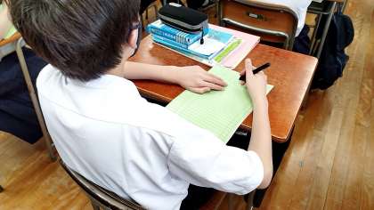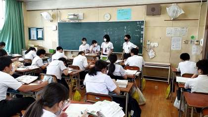 短歌十首が教材です。与えられた短歌に関する問い(文法・意味・作者など)を、代表班が生徒たちに投げかけます。便覧を活用しながら、それぞれの問いに対して、生徒たちが答えている様子です。