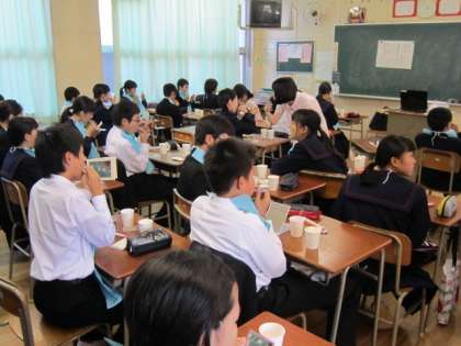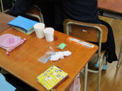大阪歯科衛生士専門学校の先生方、学生の皆さんが各クラスに5名ずつ入り、口の中の話や歯磨きの仕方を詳しく教えていただきました。その後、生徒は歯ブラシで手鏡を見ながら丁寧に磨いていきました。磨き残しがわかるよう歯を染色したため、生徒は歯磨きの不十分な個所がわかったようです。