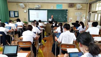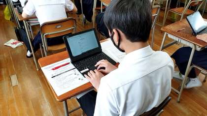 中間テスト答案返却後のすき間の時間を活用して、スタディアプリにアクセスする方法を全員で確かめました。