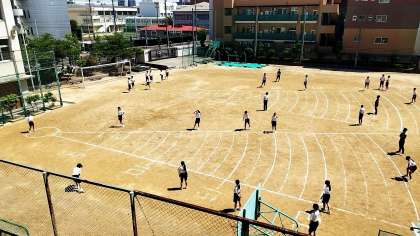 新体力テストのうち、ハンドボール投げの記録を測定中です。