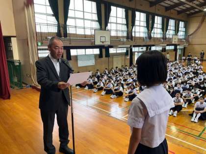 教頭先生のお話しに引き続き、保健委員会から間食に関するアンケートの協力依頼、書道部生徒表彰、生徒会から生徒評議会で決まったことがらの伝達がありました。