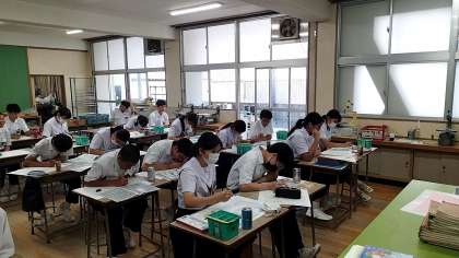 空き缶を描いています。円柱形の立体感の表現に工夫を施しながら、絵具で色をつけ始めている生徒もいるようです。