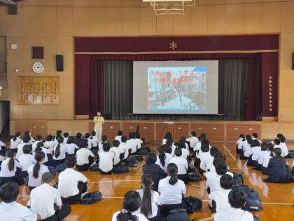 明日の校外学習に向けて、持ち物やフィールドワークの確認をしました。写真は、事前の平和学習の様子です。