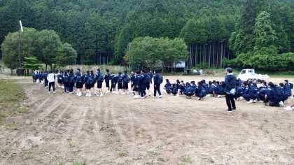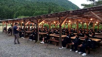 夜のレクリエーションに向けた諸注意を受け、会場の村立体育館に出発です。