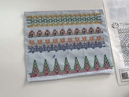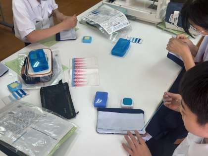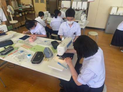 刺繍を取り入れたペンケースを製作しています。ミシンや裁縫針を使って、見本を参考にしながらデザインするようです。