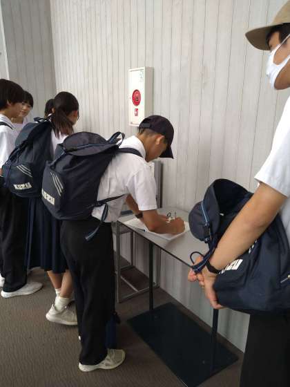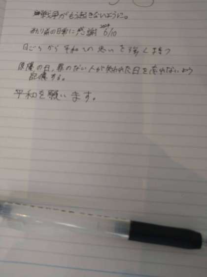 平和記念資料館内でノートに記帳する生徒の様子です。