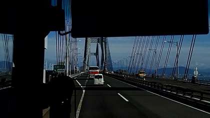瀬戸大橋をバスで渡っています。 車内に歓声が起きています?