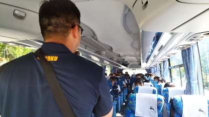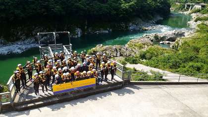 ラフティング班です。ウェットスーツに着替え記念撮影。スタート地点に向かうバス車中で、インストラクターさんから諸注意を受けました。