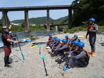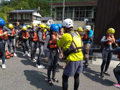 カヌー&サップ班です。ウェットスーツに着替えたのち、インストラクターさんから、諸注意を受けています。