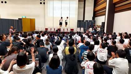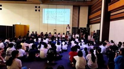 レクリエーション係の開会宣言のあとは、大クイズ大会。出題者として教員が登壇すると、場内は大盛りあがりです。