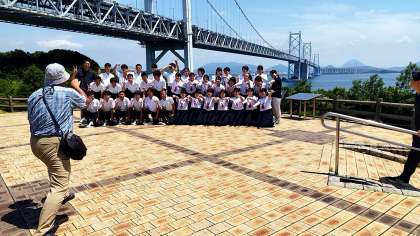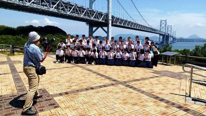 瀬戸大橋をバックに学級写真を撮影しました。1組・2組です。