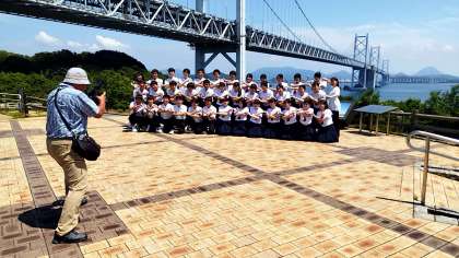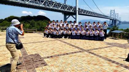 瀬戸大橋をバックに学級写真を撮影しました。3組・4組です。