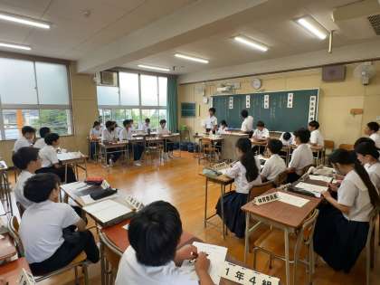 初めに、7、8月の学校目標を、各学年と常任委員会から意見を出し合って決定しました。
