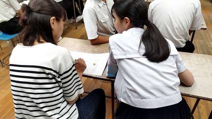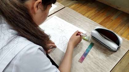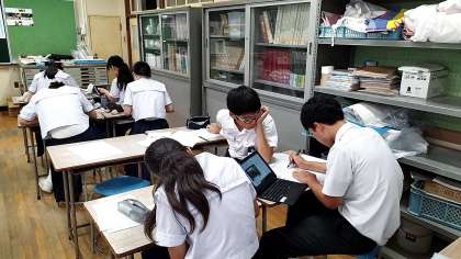 一点透視図法を用いて、部屋の絵を描いています。学習者用端末を作品づくりに役立てている生徒も見かけます。