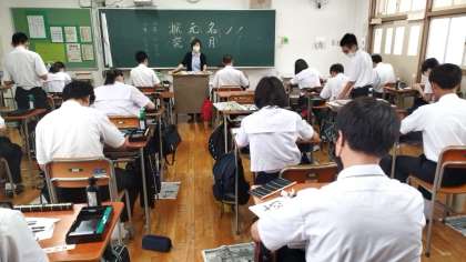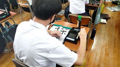 書写(毛筆)の授業です。「名月」「元気」「探究」のいずれかを選び、清書しました。