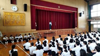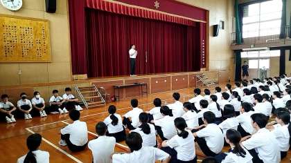 今日は教頭先生の講話です。オリンピック選手へのTVインタビューになぞらえながら、近視眼的にならず、先を見据えた目標設定の大切さについてお話しがありました。
