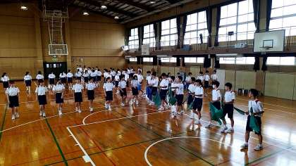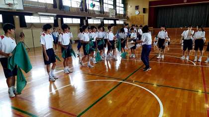 体育大会学年種目練習に取り組みました。フラッグを順番に手渡しながら、列どうしが十字に交差しています。