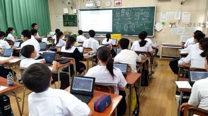 水溶液の濃度を求める学習です。学習者用端末上に、次々と演習問題が提示されます。あらかじめ編成した班ごとに、正解を導き出す早さを競っています。ゲーム的な要素を取り入れることで、子どもたちの集中力がより高まっているようです。