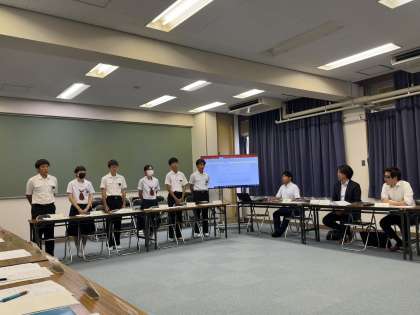 生徒会役員から、スライドを用いて1学期の活動の様子について報告しました。その後、校則の見直しについてご意見をいただきました。