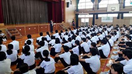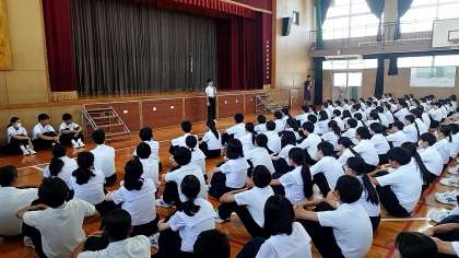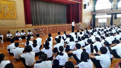 校長の式辞に引き続き、生徒指導主事、養護教諭の講話、生徒図書委員から夏休み図書特別貸出の案内がありました。
