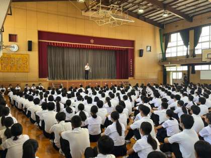 始業式では、台風に備えた心構えについてお話しがありました。引き続き、部活動や天王寺区マスコットデザインコンクールの表彰が行なわれました。