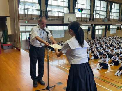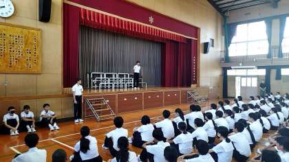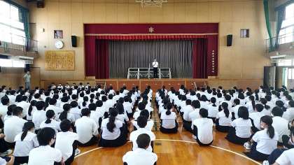 女子バスケットボール部員の表彰の後、生徒会長より、高津のきまりの見直しを進めていること。見直しが整うまでは、現行のきまりを大切にしようという呼びかけがありました。