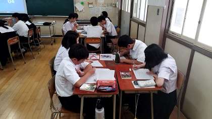 ビブリオバトル(書評合戦)の授業です。自分があらかじめ読んできた本について、持ち時間3分で紹介します。1分の質疑応答ののち、1分で感想をまとめます。班ごとにこれを繰り返し、代表生徒(最も読みたいと思った本)を投票で選びます。6人の班代表生徒のうち次時に選抜された2人は、クラス代表として学年発表会に臨みます。