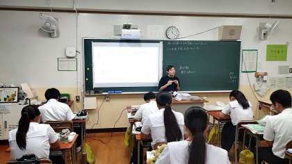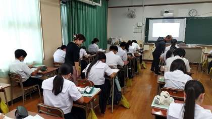 2次関数の導入の授業です。例題をもとに、x?とyの相関について法則性(比例)を見出している様子です。ティー厶ティーチング(複数の教科担当による指導)をとり入れました。