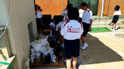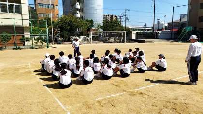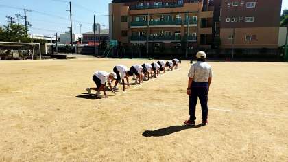 クラウチングスタートのフォームをマスターするのが、本時の目あてです。足は左右どちらを前にするのか、スタートラインに対してどの位置で構えるのかなど、自分にフィットするフォームを各自で確認しました。また、暑さを考慮し、およそ10分刻みで給水時間を確保しました。