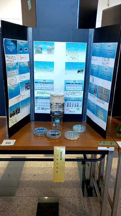本校生徒の研究成果が認められ、科学部の「浄化計画〜世界から水不足を減らそう〜」に対して最優秀賞(大阪市長賞)、また1年生生徒の「補色は何を補っているのか」と合わせて学校賞がおくられました。