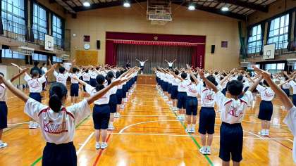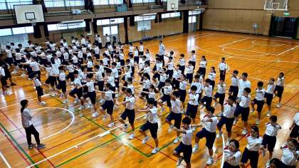 初めての学年練習です。運動場のコンディションが思わしくなく、体育館での実施となりました。