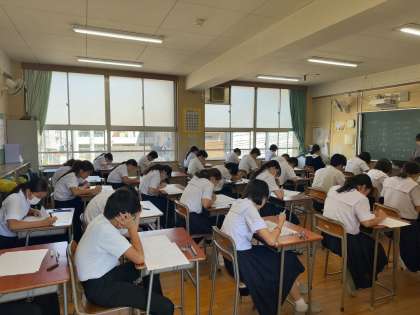 3年生が実力テストに取り組んでいます。社会、国語、数学、英語、理科の順番です。