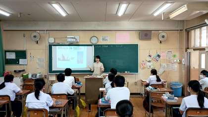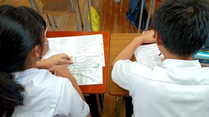 授業の始めは、大阪メトロの路線図をもとに、外国の方に英語で乗り換え案内を行う練習です。