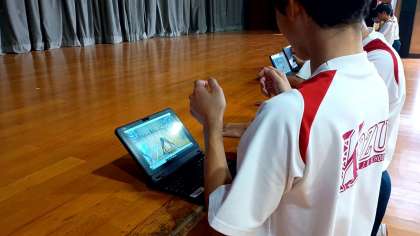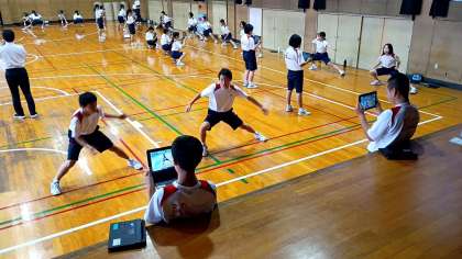 体育大会で披露したソーラン節の実技テストです。生徒はペアを組み、互いに踊る様子を動画で撮影し合います。撮れた動画をもとに、出き具合を相互にチェックします。3回ずつテストを行い、最も上手くできた踊りの動画を担当教員に提出しました。