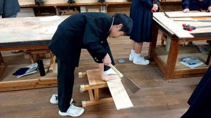 木材加工実習の授業です。ケガキを終えた板をノコギリを引いて切断します。慣れない手つきながら、全員作業を完遂することができました。