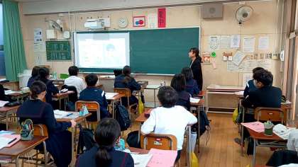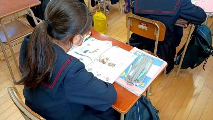 教科書本文読解の授業です。まずは、教科書を見ず、音声のみを繰り返し、大まかな意味をつかみます。次に電子教科書を用いて、文法事項をふまえながら本文を読み解いています。