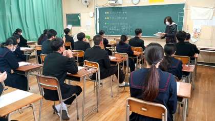 3限音楽のテスト開始直前の教室の様子です。問題用紙・答案用紙の配布を静かに待っています。