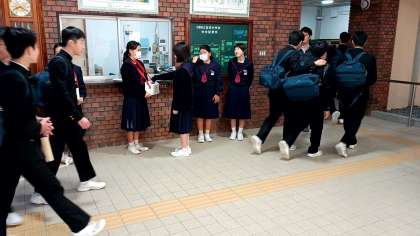 生徒会役員が、当校してきた生徒の皆さんに募金を呼びかけています。