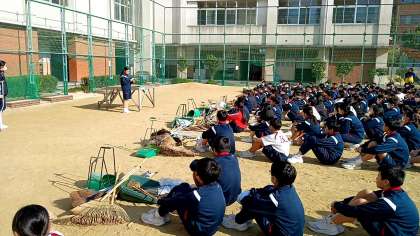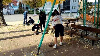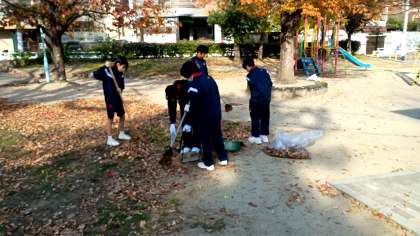 クラスごとに地域の校園を訪ね、落ち葉やゴミを掃き集めました。