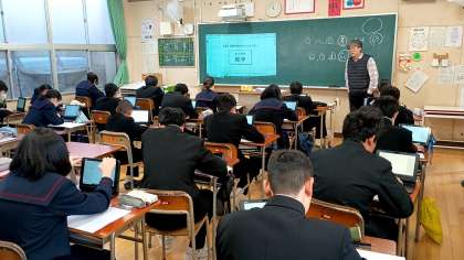 来年1月9日に実施される大阪府チャレンジテストに向けて、過去に出題された問題を学習者用端末上で閲覧し、問題を解いている様子です。
