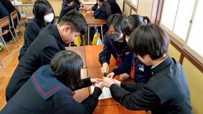 防災の単元です。グループワーク(チー厶ビルディング)を通して、不測の事態が生じたとき、リーダーの的確な指示のもと、メンバーが同じ目的意識を持ちながら行動することが大切であると学びました。