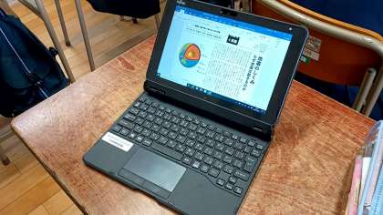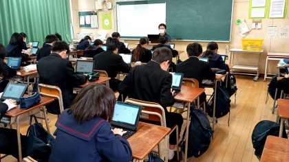 ワード機能を用いて、地震について調べた成果を新聞にまとめている様子です。