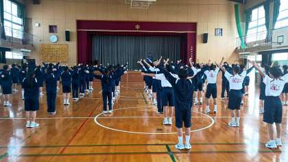 2年1組・2組は保健体育。ラジオ体操に取り組んでいました。