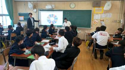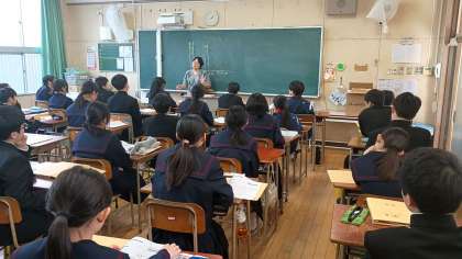1年2組は英語。担当教員とC-NET(英語指導員)による授業です。生徒が、2人の先生に英語で質問を投げかけ、先生が答える形式で授業が進められました。