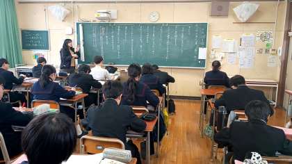 教科書巻頭の詩「名づけられた葉」を教材に、倒置法や擬人法などの表現技法について学んでいます。