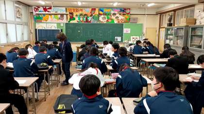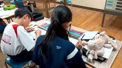 授業の前半は、似顔絵入りの自己紹介プリントに色鉛筆で彩色しました。