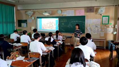 1920年代初頭、空前の好景気にわいたアメリカ合衆国の繁栄ぶりを電子黒板上の映像で確認しています。やがて世界恐慌を経て、第二次世界大戦へと歴史が進みます。