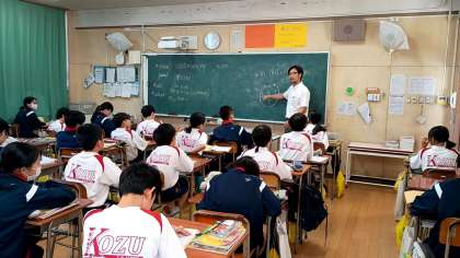 疑問詞や前置詞の和訳や言葉のニュアンスを絵図を用いながら解説しています。子どもたちからは、「なるほど」「そうなのか」と声があがっています。
