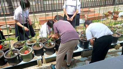 栽培の授業です。トマトの苗を鉢に植えています。収穫が楽しみですね。