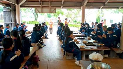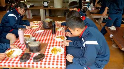 スタッフの方の挨拶、係り生徒の「いただきます」の合図ののち、カレーライスを美味しくいただきました。